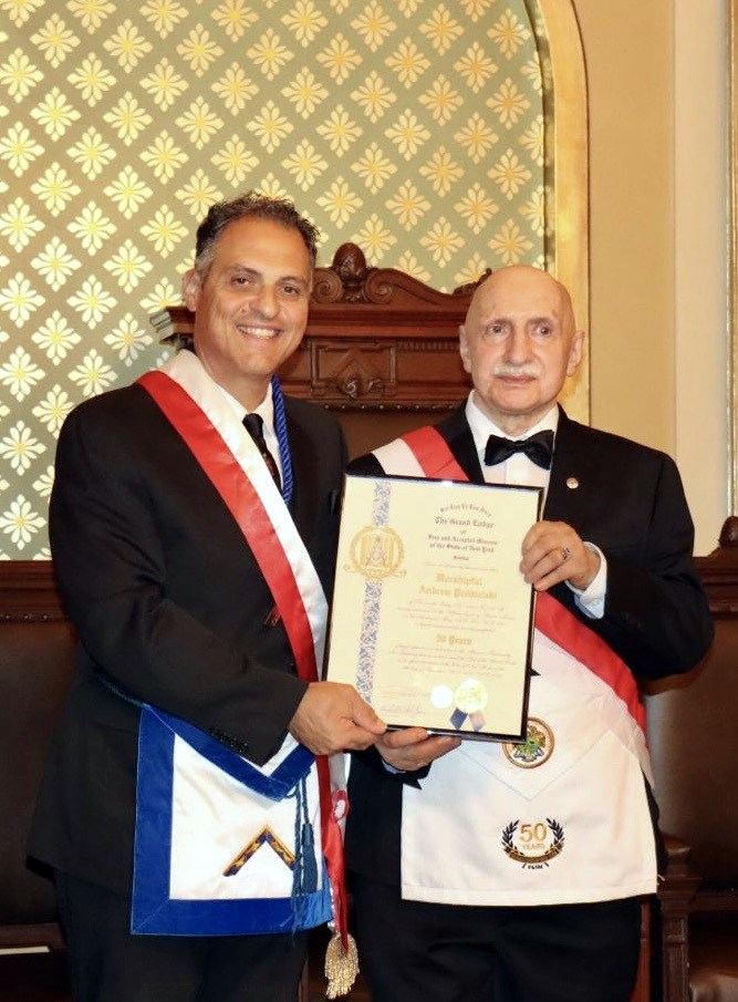 Pierwszy Dystrykt Manhatanu wręczył Wielki Mistrz William M. Sardone. Fartuszek wręczył były Wielki Mistrz Wielkiej Loży Stanu Nowy Jork